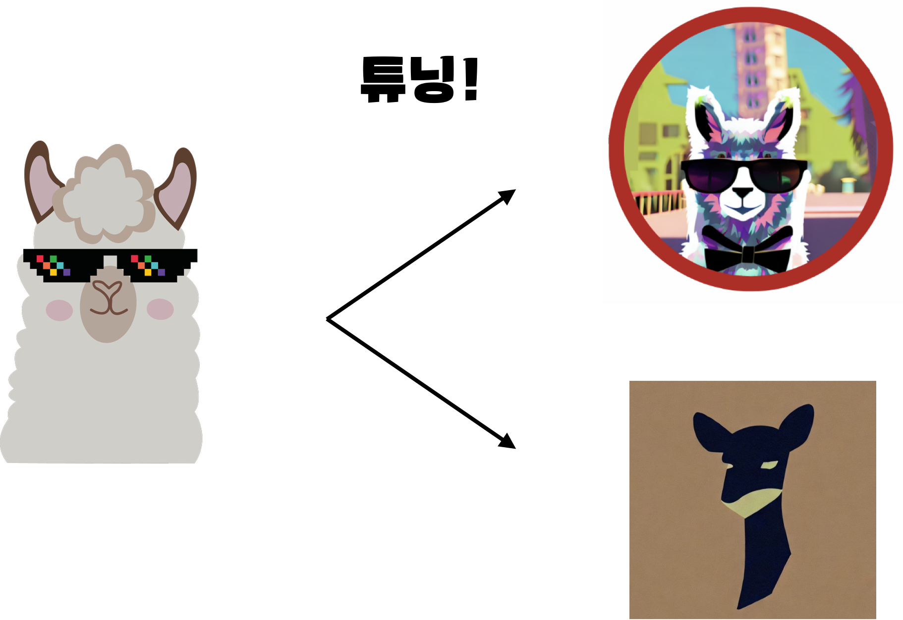 때마침 메타에서 GPT3 처럼 대량의 텍스트 데이터를 next token prediction 방식으로 학습시킨 LLM 라마를 사이즈 별로 공개합니다. 그 중에서 파라미터 수가 7B나 13B인 모델은 개인이나 대학 연구실에서도 직접 튜닝을 할 수 있는 정도의 크기였습니다. 이를 지켜본 연구자들은 이런 생각을 합니다.