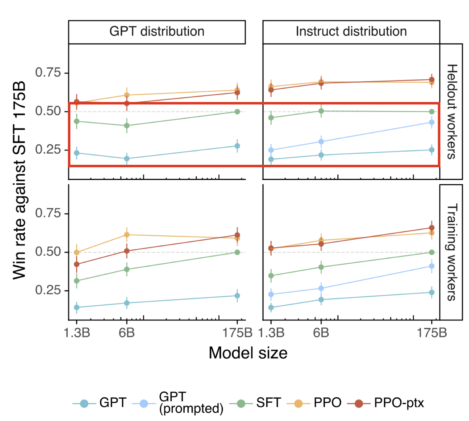 재밌는 점은 어렵고 힘든 RLHF 과정을 거치지 않고 intruct finetune만 하더라도 꽤 그럴듯한 성능을 내는 모델을 만들 수 있다는 겁니다. 아래 그래프를 보면 instruct finetune만 거친 SFT 모델이 일반 GPT보다 압도적으로 성능이 뛰어난 모습을 보여줍니다. 그리고 instruct finetune만 할 경우에는 모델의 크기가 크던 작던 큰 상관이 없습니다.