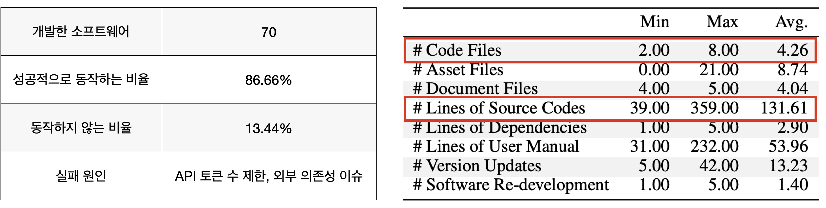 이런 방식으로 게임을 개발했을 때 들어간 토큰 비용은 약 0.3달러라고 합니다. 실제 게임 개발 비용을 생각해보면 어마어마하게 적죠? 저자들은 같은 방식으로 총 70개의 소프트웨어를 개발해보았고, 86.66%가 문제 없이 동작했다고 합니다. 하나의 소프트웨어는 평균 4.26개의 파일과 131줄의 코드로 구성되었다고 합니다.