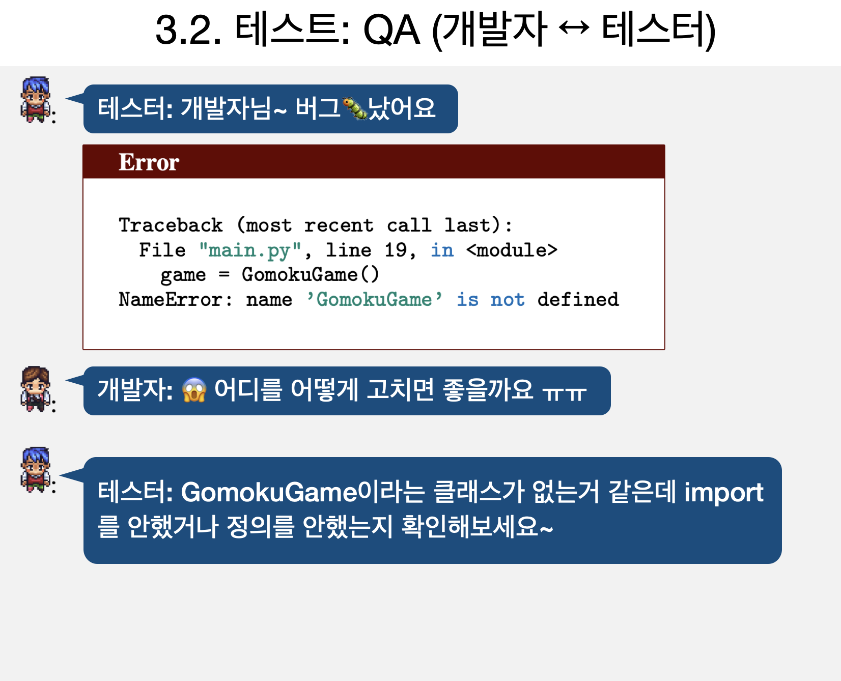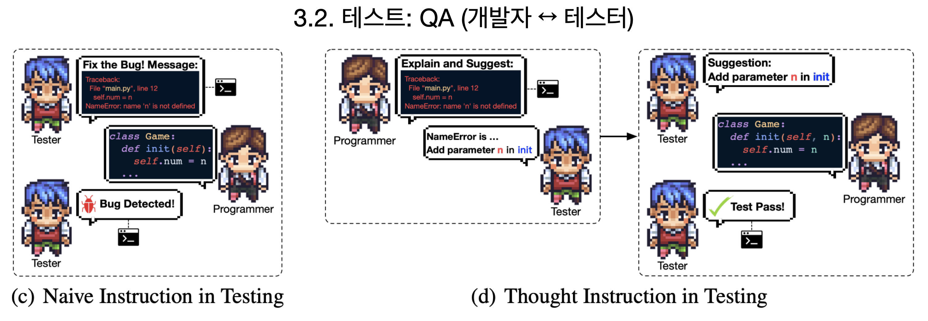 그 다음 테스터는 코드를 실행해보고 에러가 나면 개발자에게 수정을 요청합니다. 이 때, 단순히 에러 메세지만 전달하는 것이 아니라 어떻게 수정할지를 함께 제안해줍니다. (오... 이런 테스터 좋네요)이를 Though Instruction in Testing이라고 부릅니다.