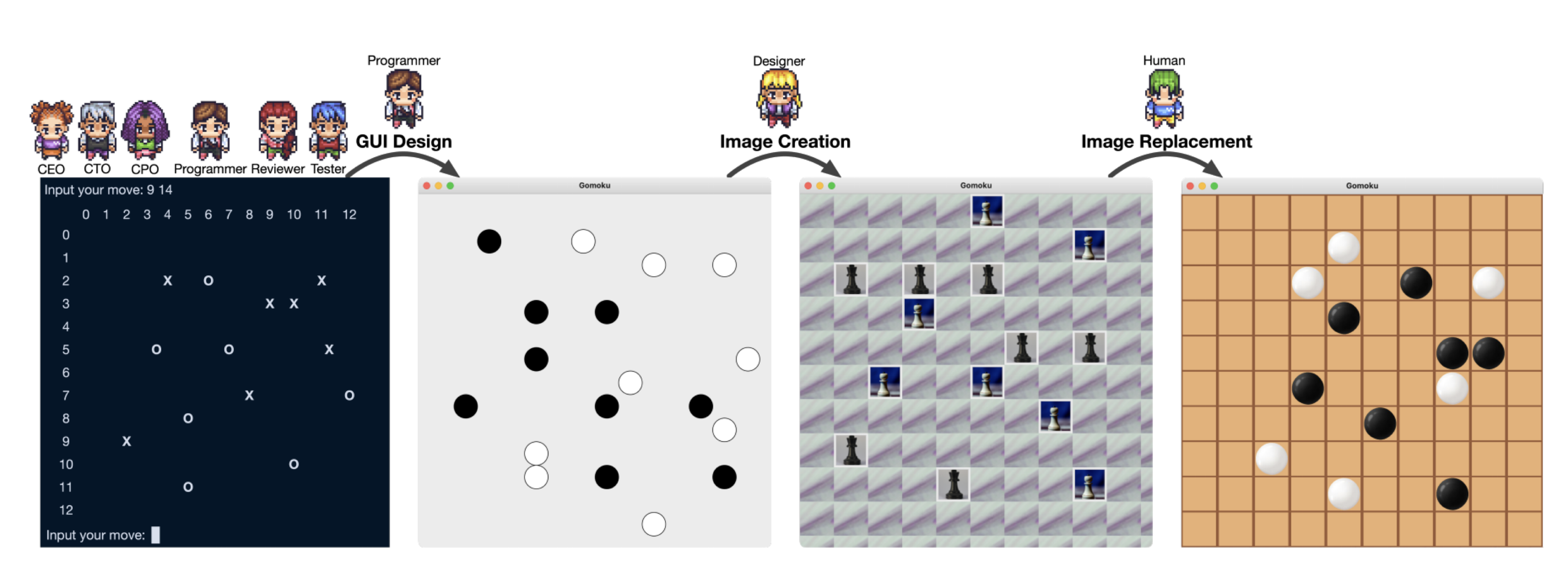 7마리의 에이전트들이 4단계에 걸친 협업의 결과로 완성한 오목 게임입니다. 사실상 3단계까지가 AI가 만든거고, 마지막 단계는 인간이 개입해서 이미지를 갈아끼운 것이니 무시해주세요.