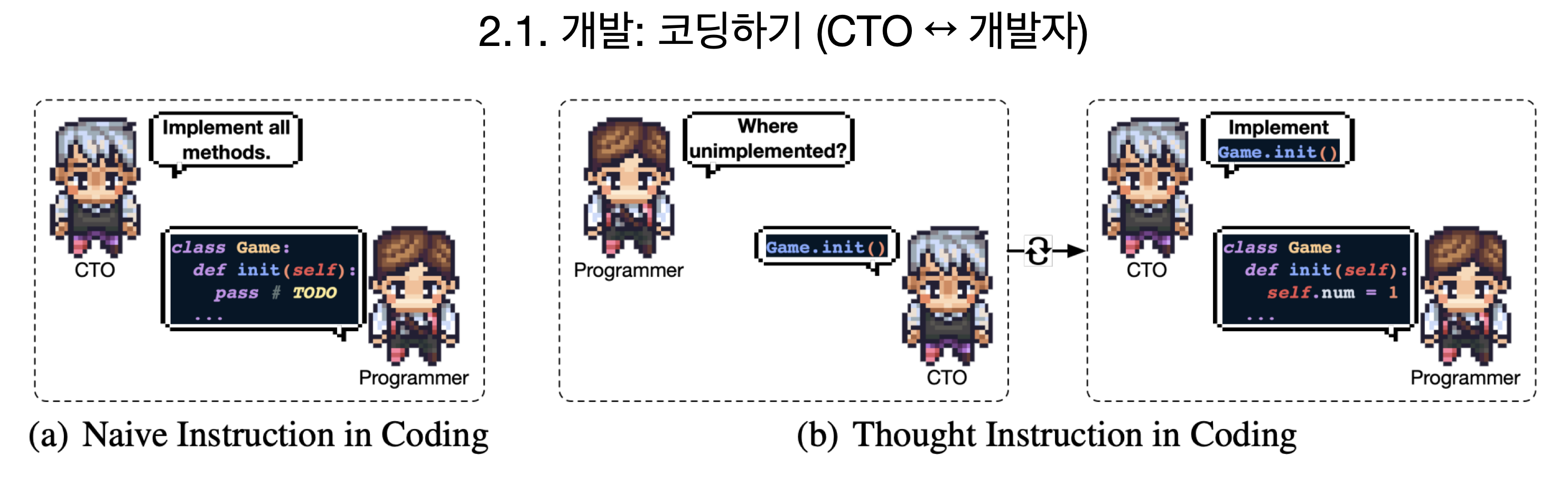 먼저 CTO는 개발자에게 코드를 작성하라고 지시합니다. 이 때, 전체를 한번에 구현하라고 지시하는 것이 아니라, 어느 부분을 구현하라고 명확하게 지시합니다. 이를 Thougth Instruction in Coding 이라고 부릅니다.