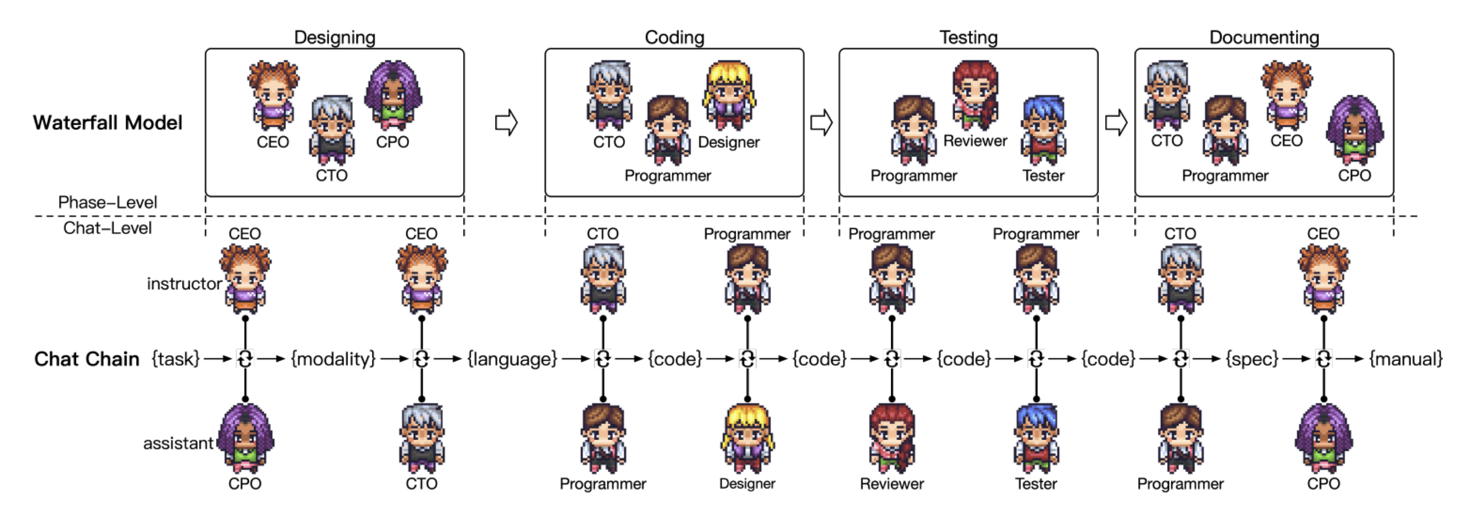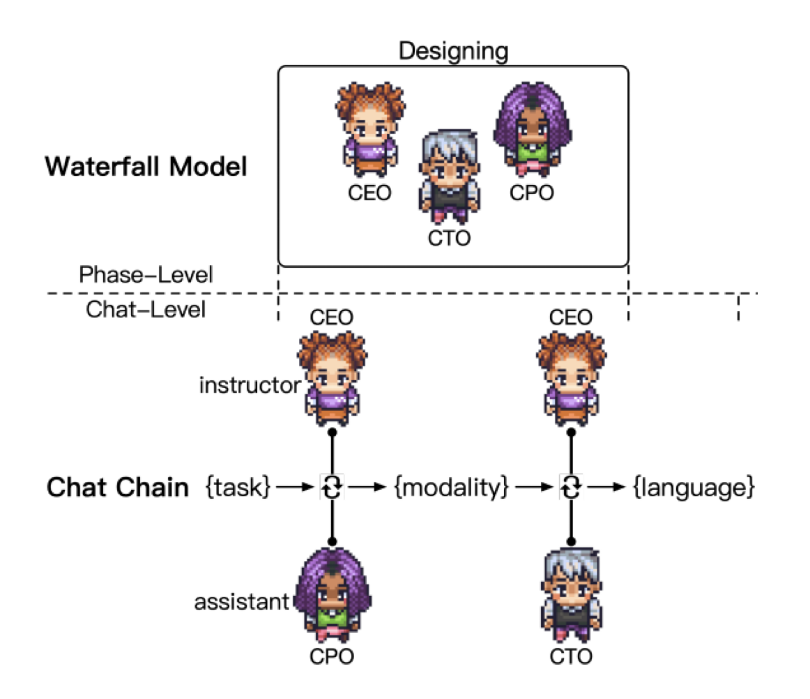 Chatdev의 임직원들은 소프트웨어 개발 방법 중 하나인 Waterfall 방식을 본따서 협업하며 소프트웨어를 개발합니다. Waterfall 방식은 크게 기획, 개발, 테스트, 문서화 단계로 이루어집니다. 각 단계별로 참여하는 에이전트들이 달라집니다.