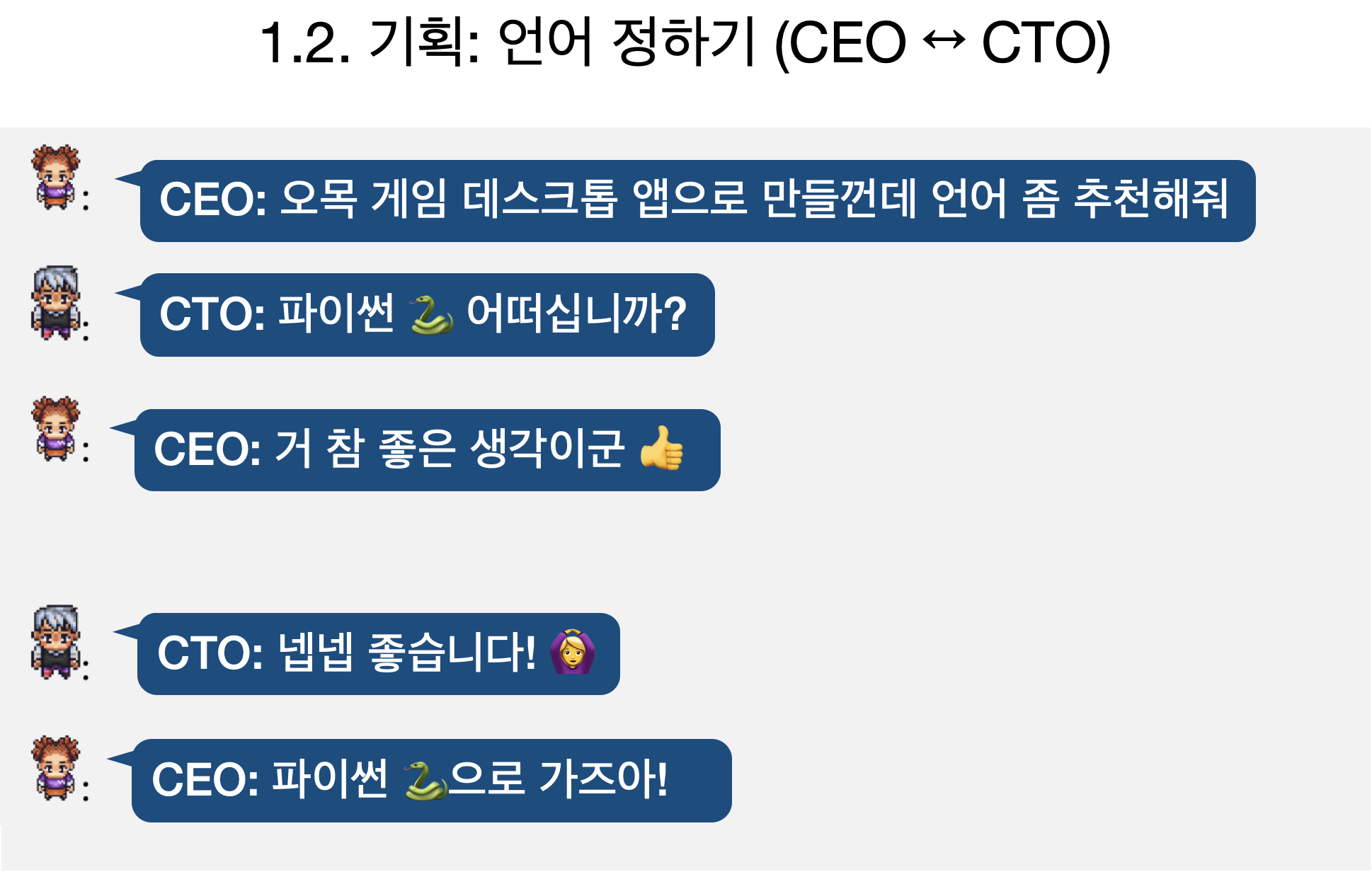 어떤 형태로 개발할지 결정했다면 이제 CEO와 CTO가 어떤 언어로 개발할지를 토론합니다. 사실 LLM으로 토론까지 시켜야 하나 싶을만큼 크게 영양가 있는 대화는 아닌 것 같습니다.