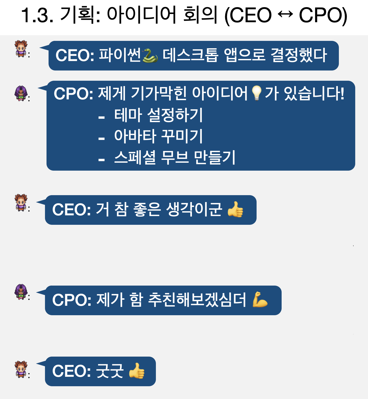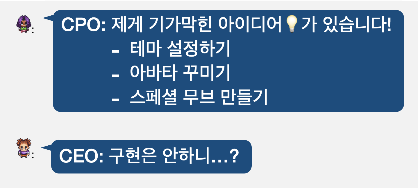 - 게임 회사 CEO, CTO, 개발자, 디자이너 등 역할을 가진 아바타를 LLM으로 만들었다.
