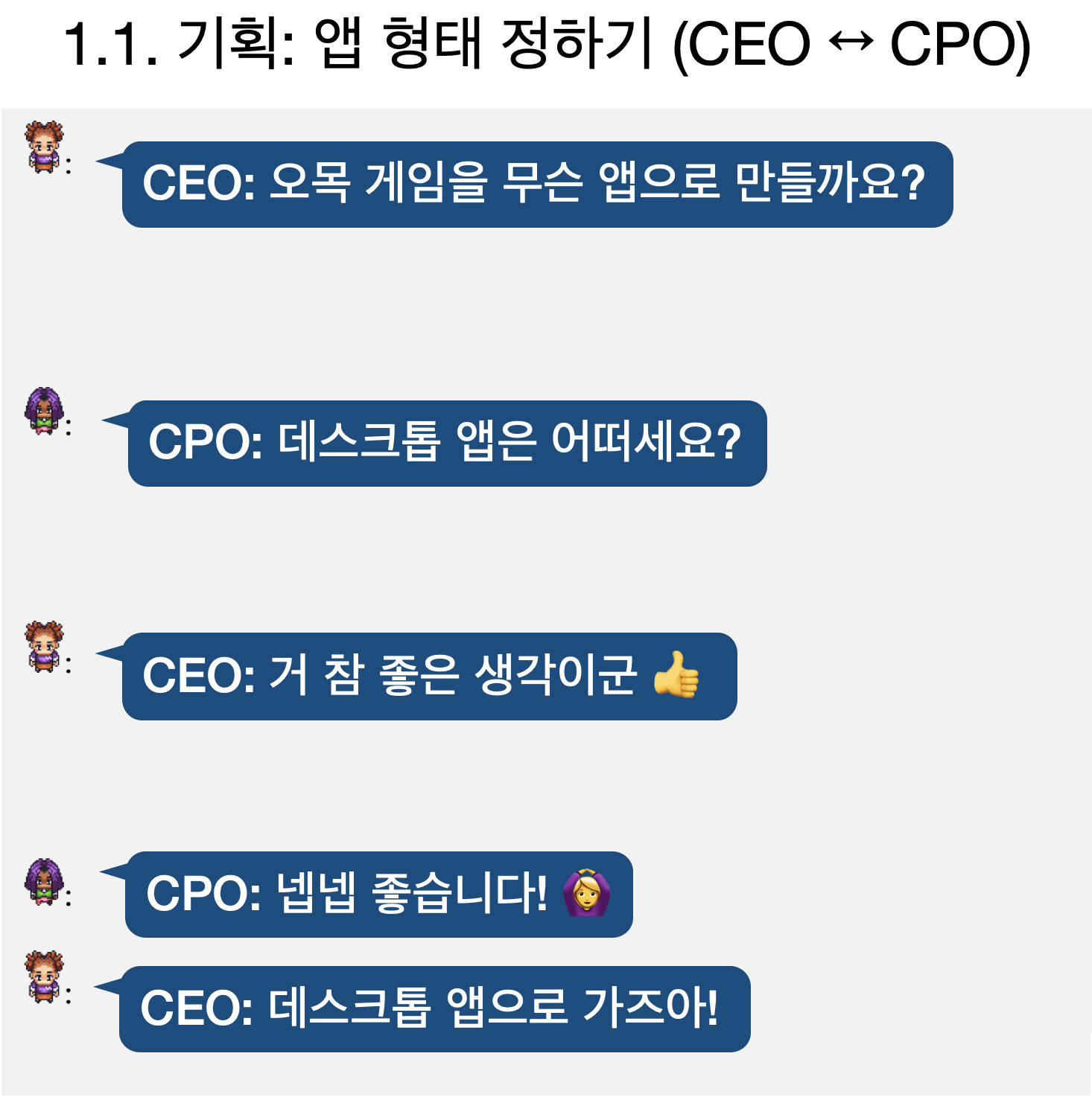 기획 단계에서는 CEO, CPO, CTO가 대화를 통해 어떤 앱을 개발할지, 언어는 어떤걸 사용할 지 결정합니다.