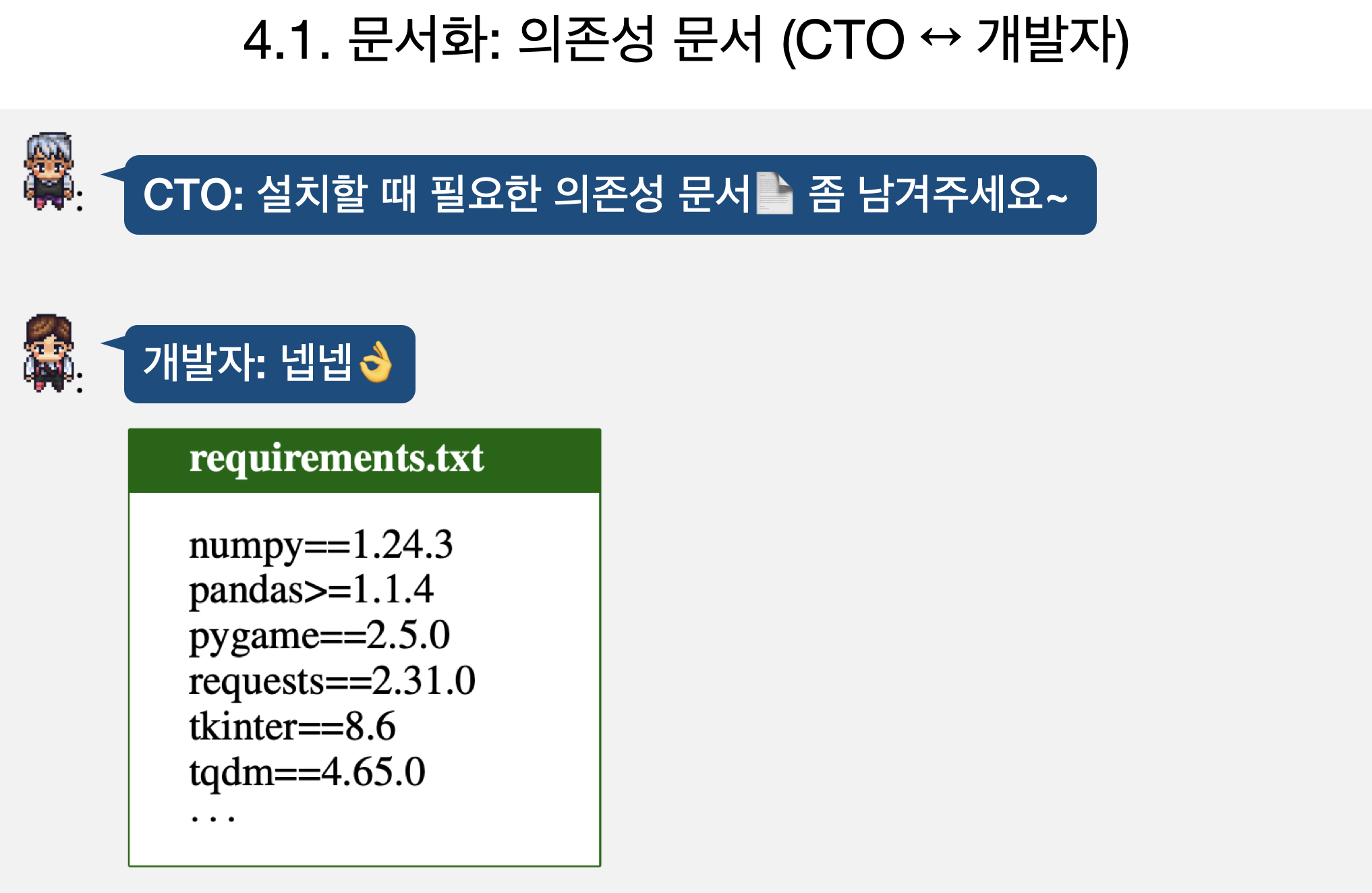 테스트 단계가 완료된 코드는 이제 문서화 단계로 넘어갑니다. CEO, CPO, CTO, 개발자가 환경 설정, 설치, 코드 실행 등의 문서를 작성합니다. 먼저 CTO와 개발자가 코드 실행이나 환경 셋팅 문서를 작성합니다.