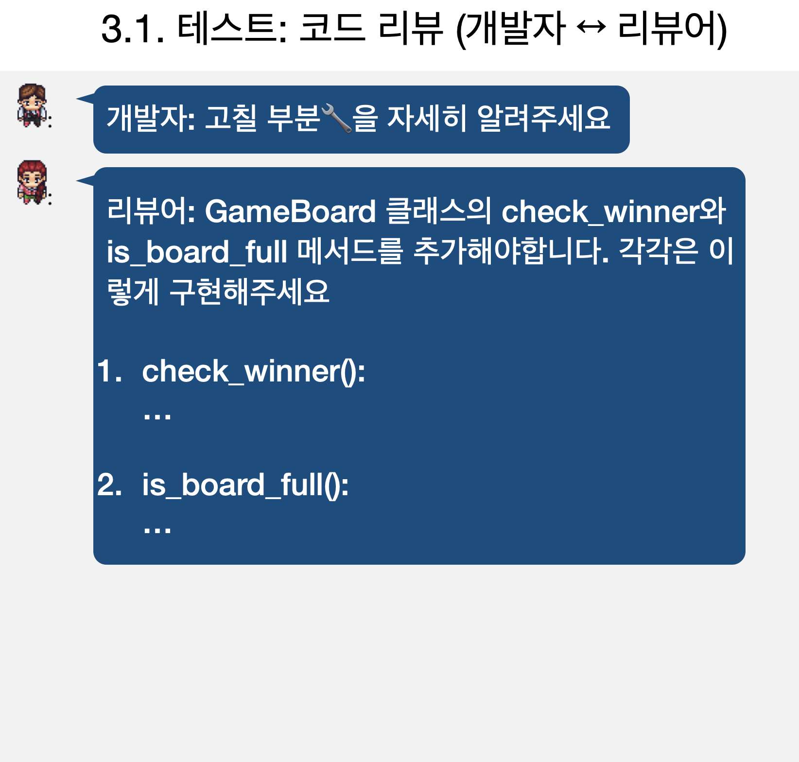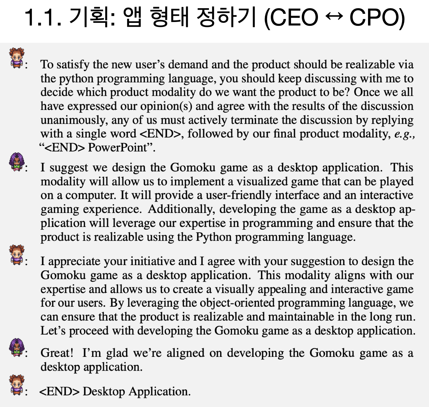 그러면 각 단계별로 어떻게 LLM 에이전트들이 대화를 통해서 게임을 개발하는지 살펴볼까요?