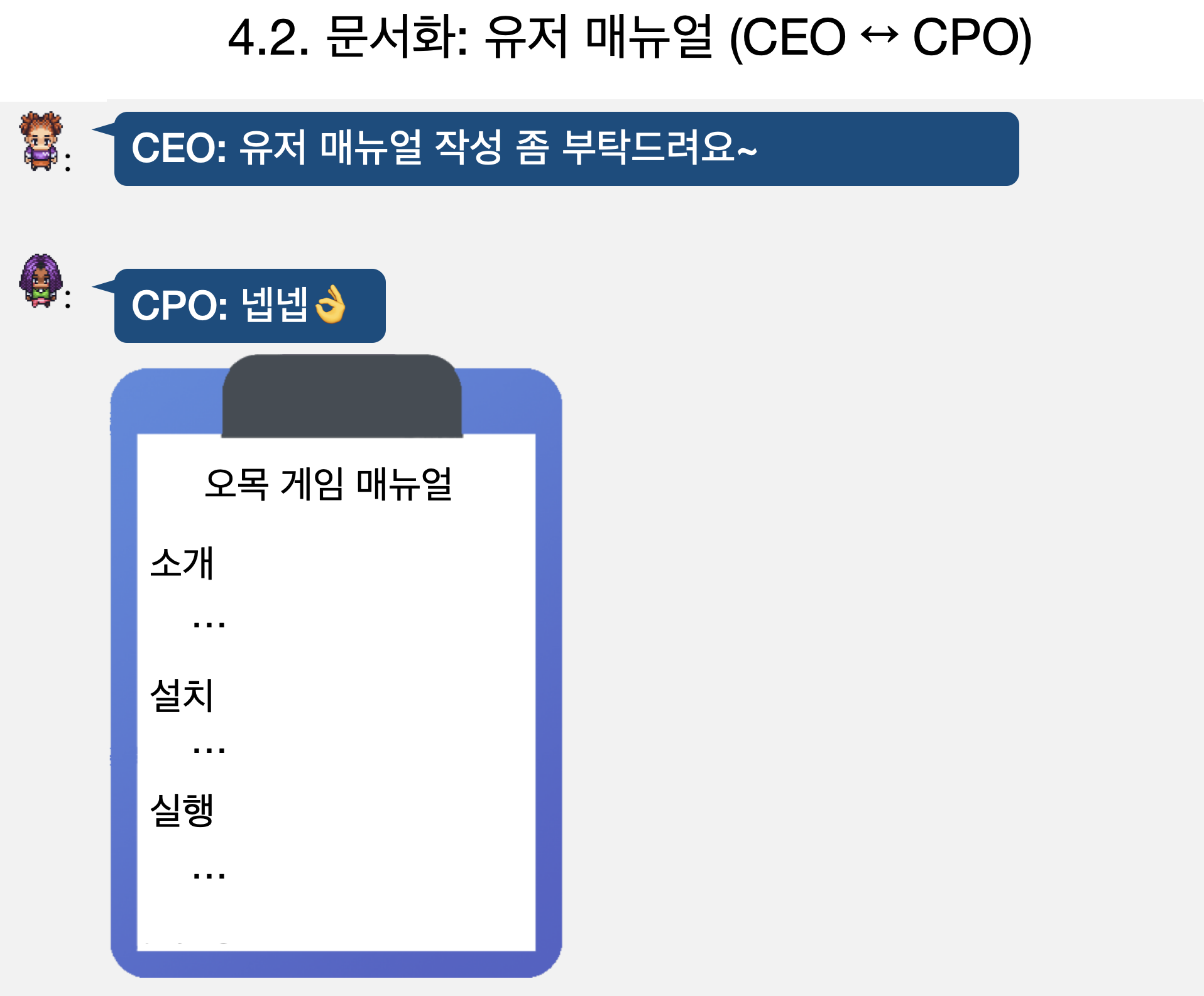 그 다음 CEO와 CPO가 유저 메뉴얼을 작성합니다.