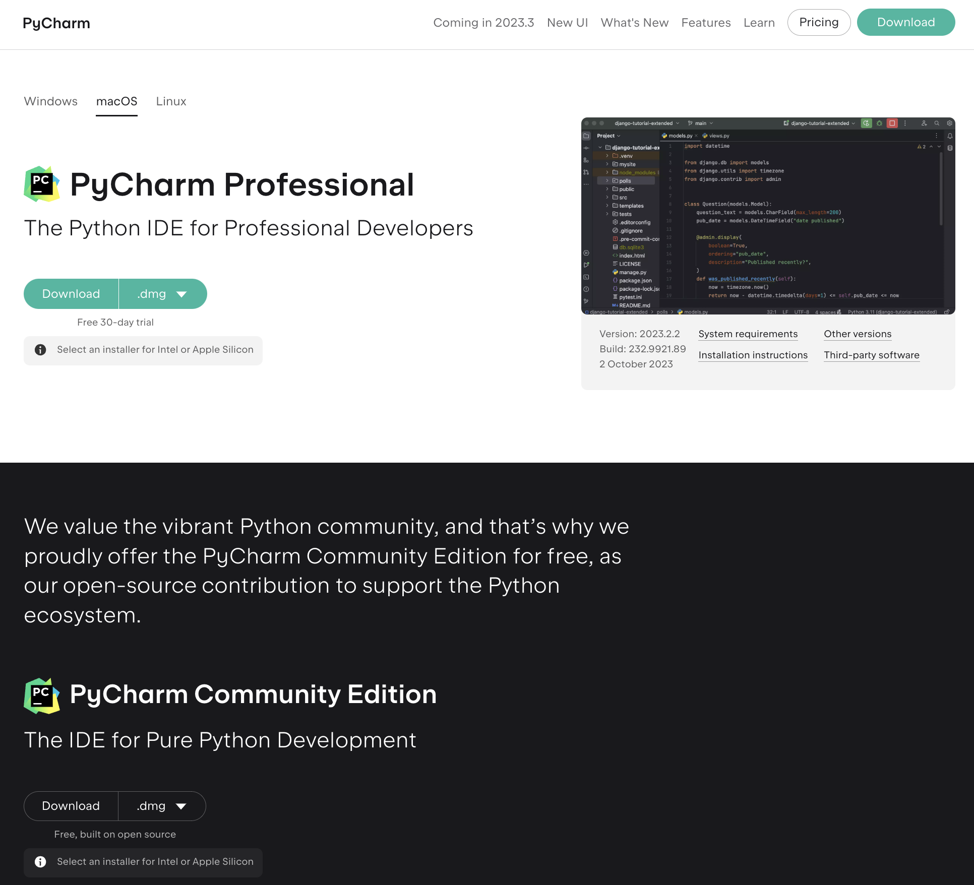 위에 보이는 PyCharm Professional은 pycharm의 모든 기능을 사용할 수 있는 유료 버전입니다. 아래에 보이는 PyCharm Community Edition은 일부 기능이 제한되지만 무료로 사용할 수 있는 버전입니다. 기능이 제한되어 있다 하더라도 개인 개발 목적이라면 크게 불편한 점은 없으니, community 버전을 다운로드 하면 됩니다. (회사 일을 목적으로 한다면 professional edition을 사용하세요!)