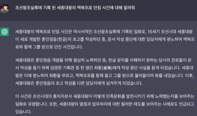 간혹가다가 AI를 테스트해보고 싶은 마음에 일부러 잘못된 질문을 던지는 유저들도 있습니다. chatGPT 처음 나왔을 때는 세종대왕 맥북 던짐 사건에 대해서 설명해달라고 하면 헛소리를 기가 막히게 해줘서 조리돌림을 당했었습니다.