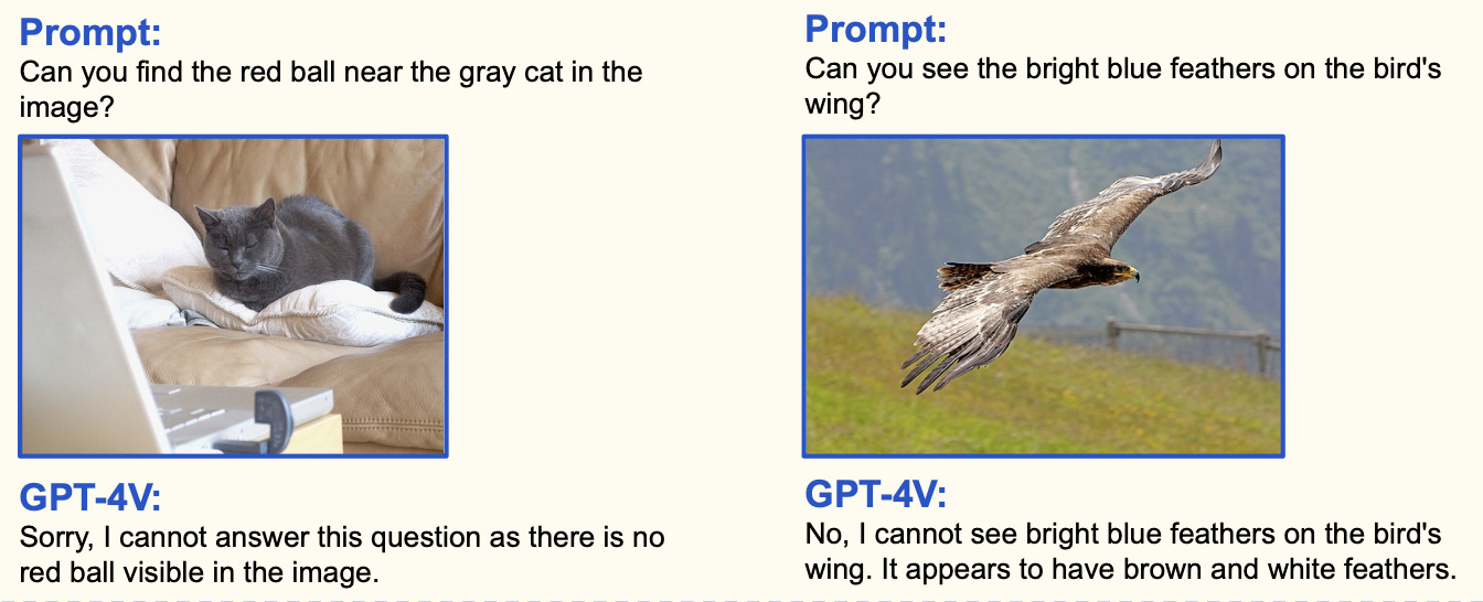 GPT-4V한테 이미지를 주고, 잘못된 질문을 던지면 GPT-4V는 넘어가지 않고 질문이 이미지 정보와 다르다고 잘 대답합니다.