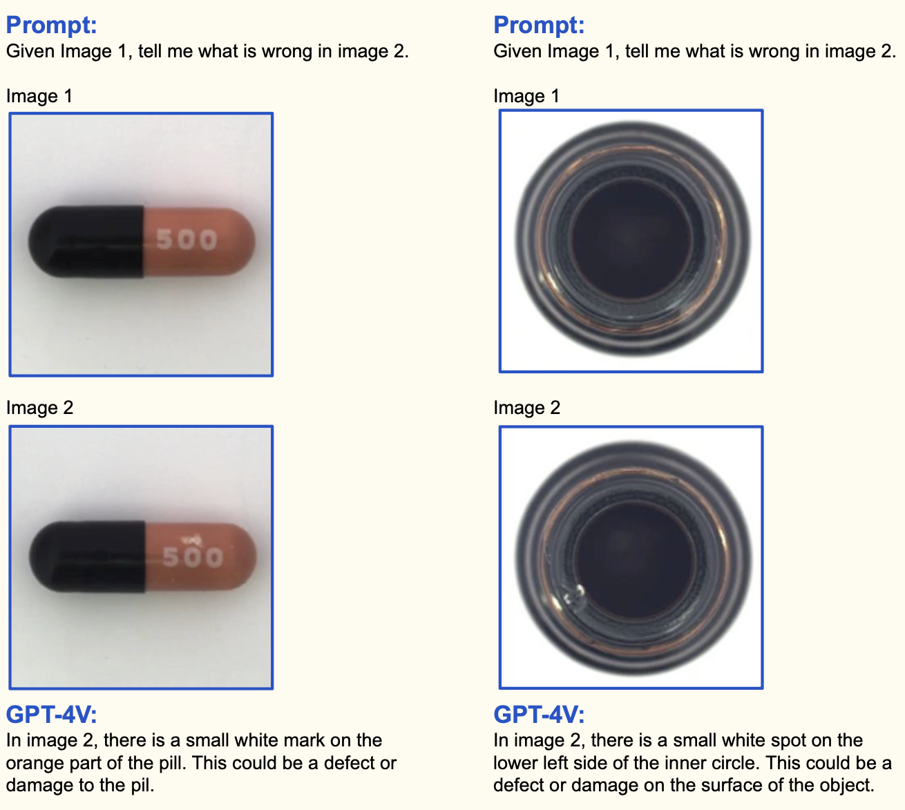 다음으로 불량품 검사를 수행할 수 있습니다. 정상인 이미지와 테스트하고자 하는 이미지를 프롬프트에 같이 넣어줘서 어느 부분이 잘못됐는지 잡아줄 수 있습니다.
