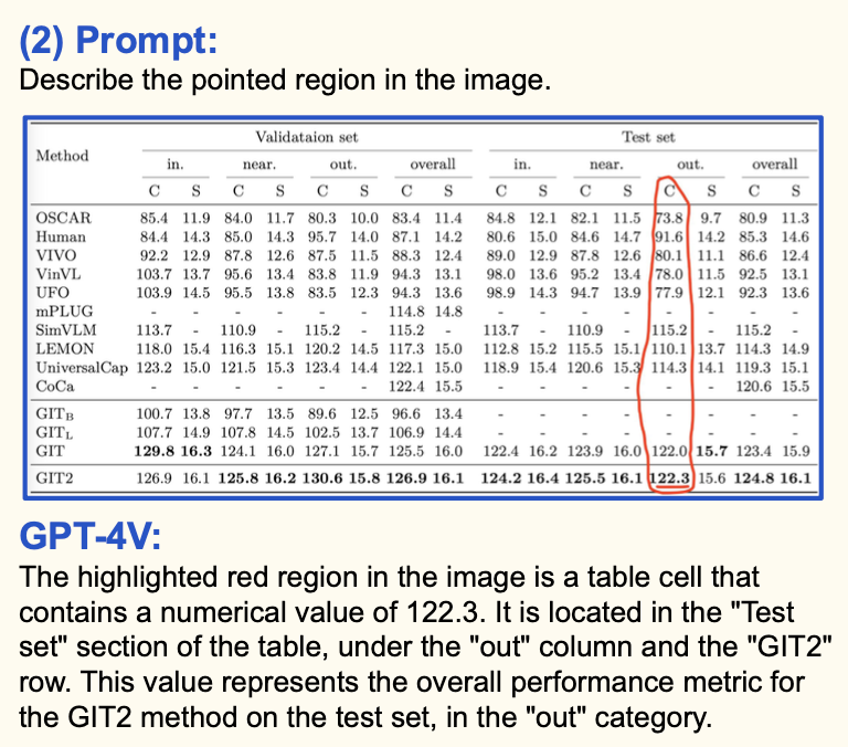 이번에는 좀 더 꼬아서 도표에 원과 밑줄을 치고, 이를 인식하는지 테스트 해봤습니다. 그랬더니 out 컬럼의 GIT2 row 값은 122.3이라고 정확히 답해줍니다.
