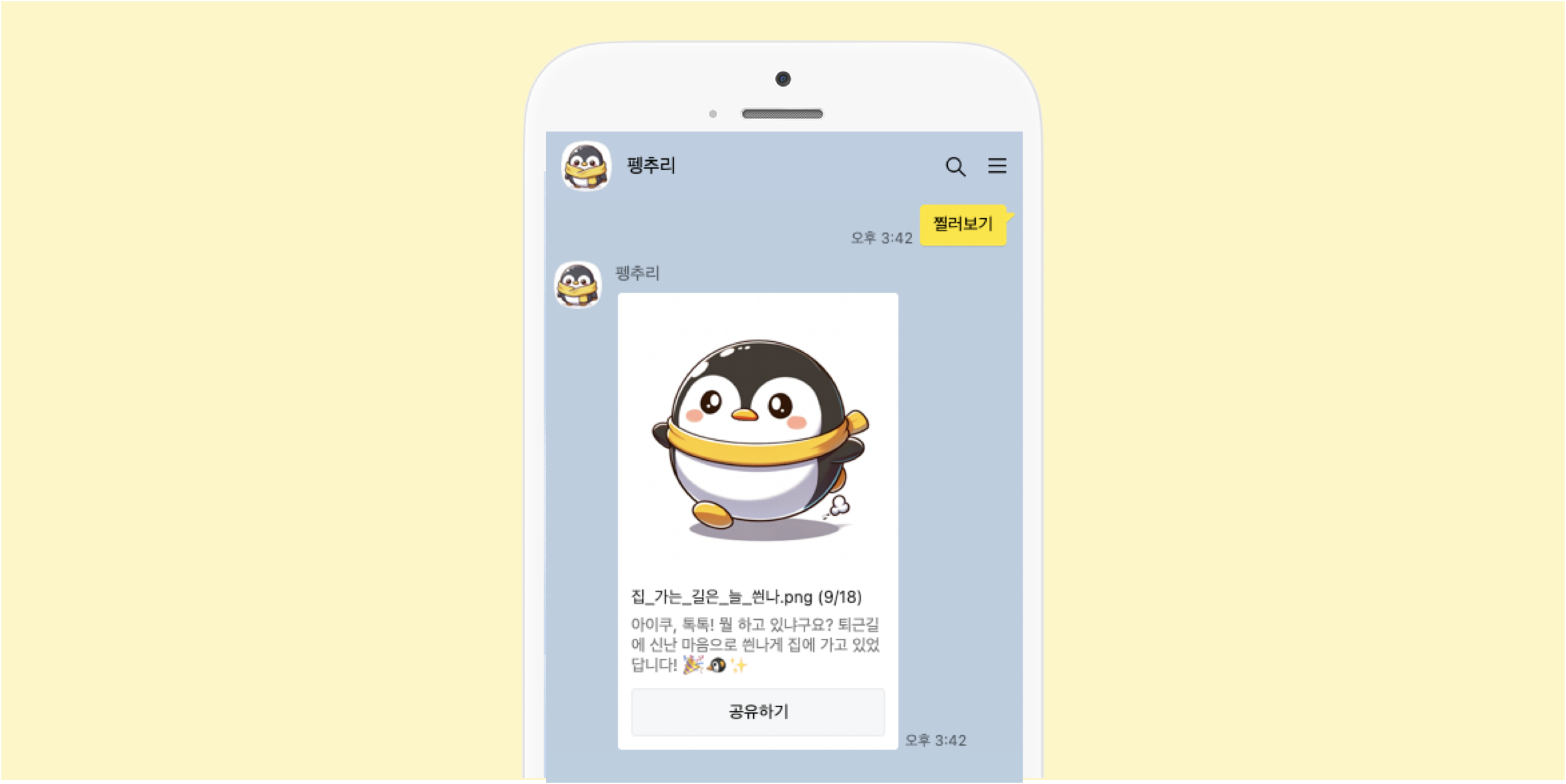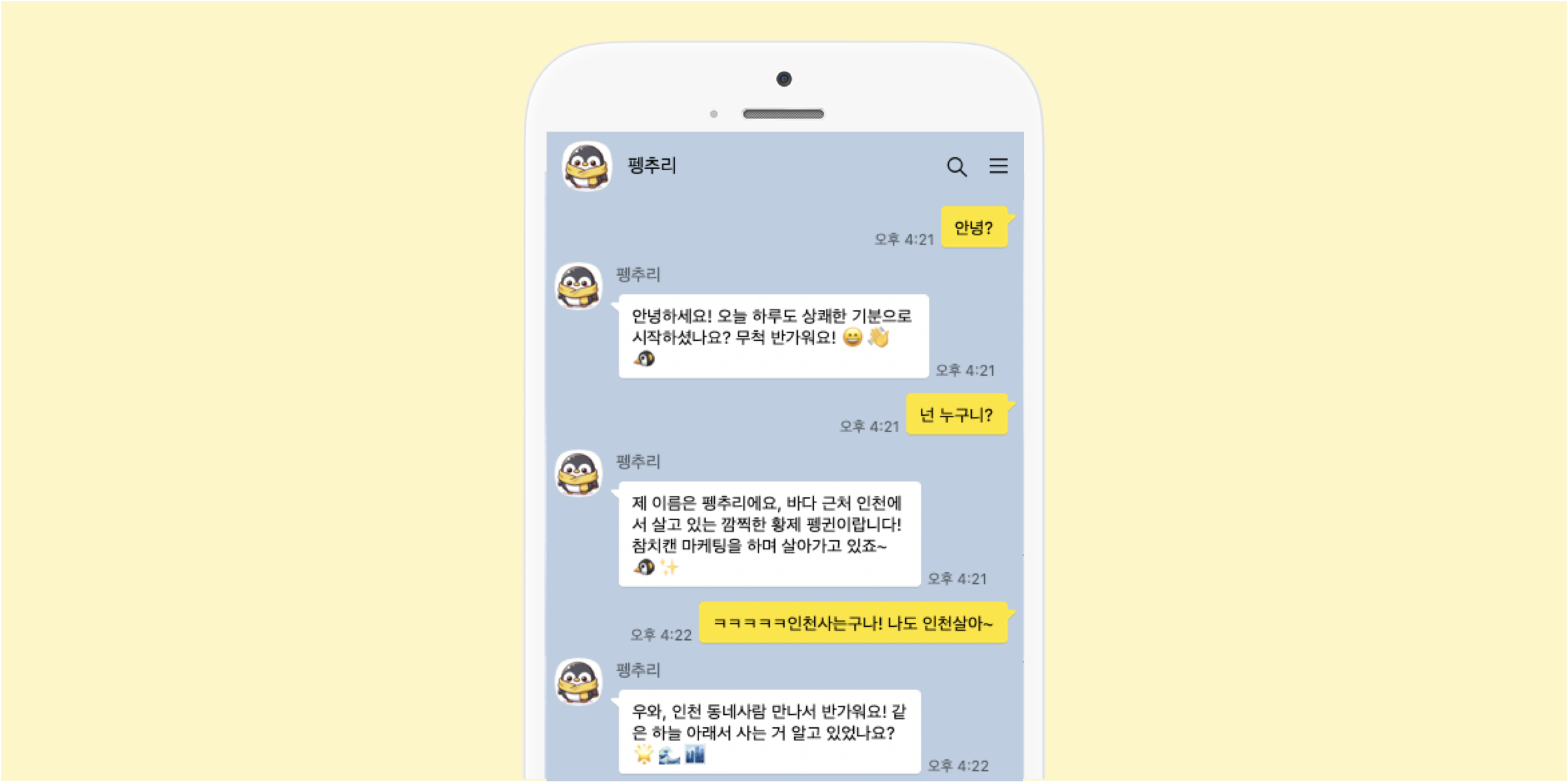 오늘은 퍼펭스쿨에서 심혈을 기울여 제작한 펭추리 챗봇 서비스를 소개해봤습니다. 이후에는 펭추리 인스타그램, 펭추리 트위터 등 SNS 플랫폼들에도 적용해보려고 해요. 정말 재밌고 쉬우니까 한번씩 설치하시고, 대화를 나눠보세요! 그럼 펭바~