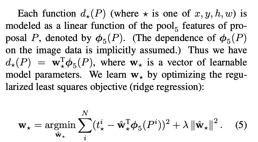 질문의 요지는 벡터 w만을 학습시키는 것이 bounding box regression에 충분한가? 과연 선형 회귀 만으로 가능한 것인가? 였습니다. 먼저 w*의 차원을 한 번 살펴보겠습니다. φ(Pi)는 VGG넷의 pool5를 거친 피쳐맵으로, 원래의 VGG에서는 이를 쫙 펴서 4096 차원의 벡터로 만든 다음 FC에 넘겨줍니다. 즉, φ(Pi)를 4096 차원 벡터라고 보면 w*역시 4096 차원 벡터인 것을 알 수 있습니다.