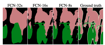 아래는 위 기법을 각각 적용하여 얻은 시맨틱 세그맨테이션 결과입니다. 보시면 앞단의 컨볼루션 피쳐맵들을 합쳐서 구한 결과가 디테일이 더 많이 잡히는 모습을 볼 수 있습니다.