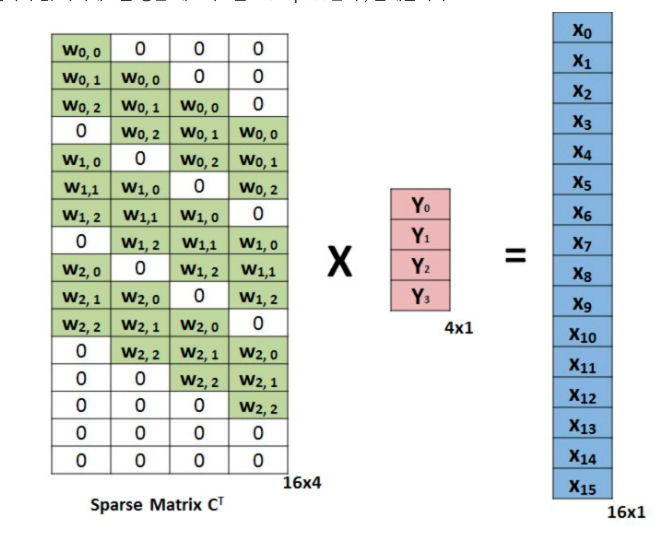 예시로 주어진 행렬 곱의 크기는 컨볼루션 (4x16) x 입력 이미지(16 x 1) = 피쳐 맵(4 x 1)이 됩니다. 우리가 하고 싶은 것은 (4x1)의 피쳐 맵에 컨볼루션을 거꾸로 수행하여 원래 이미지 크기를 복원하는 것입니다. 이를 위해서 컨볼루션 행렬의 transponse를 피쳐 맵에 곱해주면 됩니다. 아래 그림을 보겠습니다.