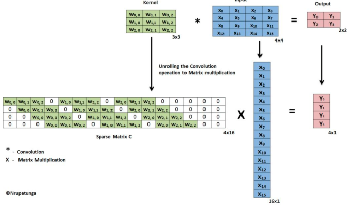 다음으로 알아볼 기법은 이 논문에서 핵심적으로 사용한 deconvolution입니다. 논문에서는 deconvolution으로 적혀있지만 transpose convolution으로도 불립니다. 핵심 개념은 컨볼루션 레이어를 거꾸로 적용하자는 것입니다. 다음 그림 자료는 [3]과 [4]에서 가져왔습니다. 먼저 Convolution 연산을 행렬 곱으로 표현하면 다음과 같습니다.