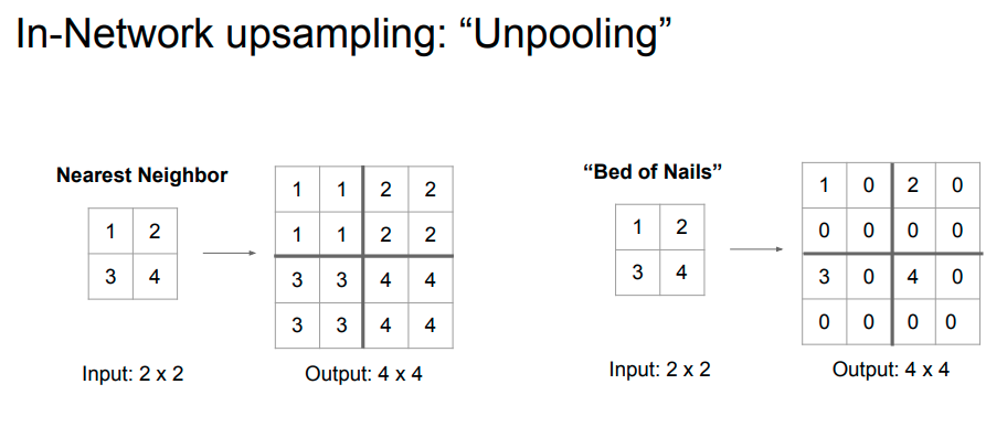 앞서 1x1 Conv를 거쳐서 인풋 이미지보다 크기가 작은 피쳐맵을 뽑아냈습니다. 이를 다시 키워주기 위해서 여러가지 기법들을 적용할 있습니다. 다음 자료는 [2]에서 가져왔습니다. 먼저 Unpooling입니다. Maxpooling을 그래도 거꾸로 재현하여 주변 픽셀들을 동일한 값으로 채우거나, 0으로 채워주는 방식이 있습니다. 하지만 이는 원래 Pooling을 적용하였을 때 상태의 위치 정보를 기억해내지 못합니다.