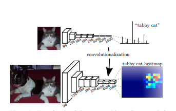 논문에서는 FCN은 1x1 컨볼루션으로 대체할 수 있으며, 이는 Classification을 수행하는 다른 일반적인 CNN 모델에도 동일하게 적용할 수 있습니다. 아래 그림은 Conv 레이어 이후 클래시피케이션을 수행하는 모델에서 뒷 단을 1x1 컨볼루션 레이어로 바꾸면 어떤 결과가 나오는 지를 보여줍니다.