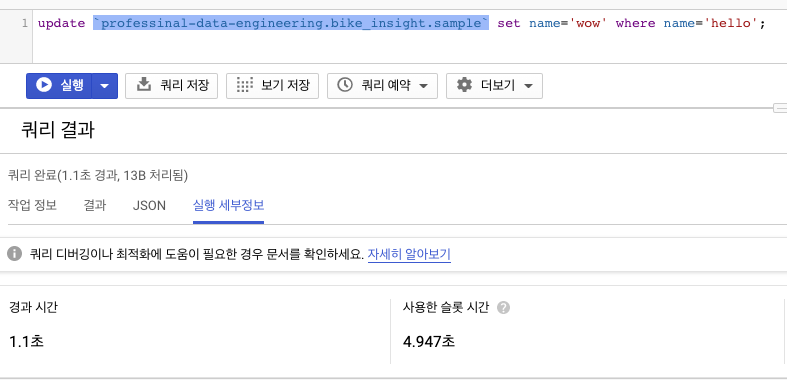 (덧붙이자면 Dremel은 update문을 지원 안한다고 논문에 나와있었습니다. 그래서 당연히 빅 쿼리도 지원을 안할 줄 알았는데 insert나 update문이 동작하긴 하네요 ㅎㅎ)