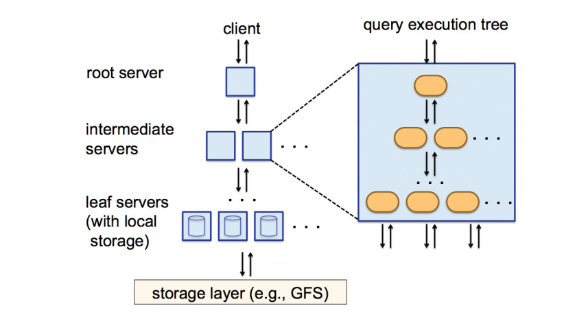 구글은 수천대의 머신에 쿼리 연산을 분산시키기 위해서 트리 구조를 활용합니다. 루트 서버는 클라이언트의 SQL 쿼리문을 분석하여 분산 머신에서 동작하는 수많은 작은 단위의 쿼리문들을 만들고 이를 intermediate servers에 전달합니다. 이 서버들은 다시 실제 연산을 수행하는 리프 노드들에게 쿼리를 전달하고, 쿼리의 결과 값으로 반환되는 값들을 합쳐서 부모 노드에게 전달해줍니다. 좀 더 자세한 내용은 Dremel 논문 리뷰 포스팅에서 다뤄보도록 하겠습니다.