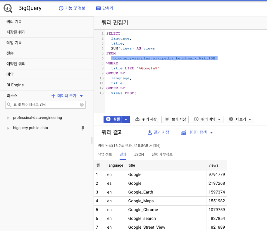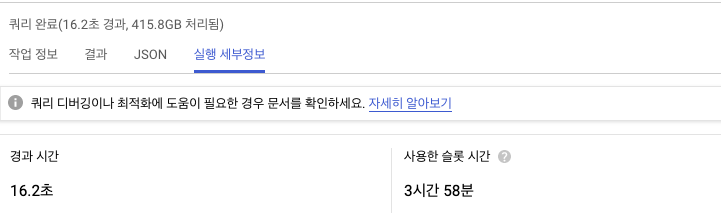 빅 쿼리는 해당 SQL문을 수행하는데 415.8GB에 달하는 데이터를 처리하여 16.2초 만에 주어진 SQL문을 수행하였습니다. 슬롯이라는 것은 빅 쿼리가 분산 처리를 하는 단위인데 이에 관련해서는 다음 포스팅에서 자세히 소개하도록 하겠습니다. 여기서는 분산 처리를 하지 않고 단일 머신으로 해당 쿼리를 수행했을 경우 소요되는 시간이다 정도로 이해하고 넘어가겠습니다.