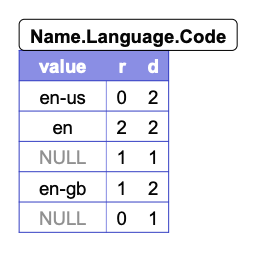 그 아래로 넘어가보면 마지막 Language가 보이고 en-gb라는 Code가 보입니다. 이는 이전에 등장한 동일한 path의 값 en과는 같은 Name에 속하므로 r=1이 됩니다. r2에도 동일한 방식을 적용하여 정리를 해보면 아래와 같은 결과를 얻을 수 있습니다.