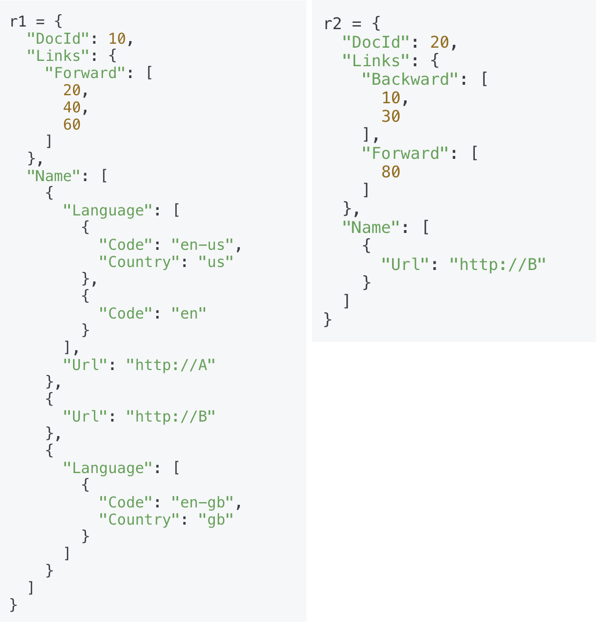 위 그림은 Dremel에서 데이터를 저장하는 스키마와 그 예시를 보여줍니다. (검색 회사 답게 예시도 웹 문서의 메타데이터 같습니다.) 살펴보면 required, optional, repeated 등의 생소한 단어들이 보입니다. 이를 우리에게 친숙한 json 방식으로 설명해보자면 group이란 여러 필드들이 묶여있는 객체이고, repeated란 배열을 의미합니다. optional group Links라는 것은 Document에서 있어도 되고 없어도 괜찮은 객체 멤버 변수 Links라는 의미입니다. 메타데이터 r1과 r2를 json으로 바꾸어 표현하면 아래와 같습니다.