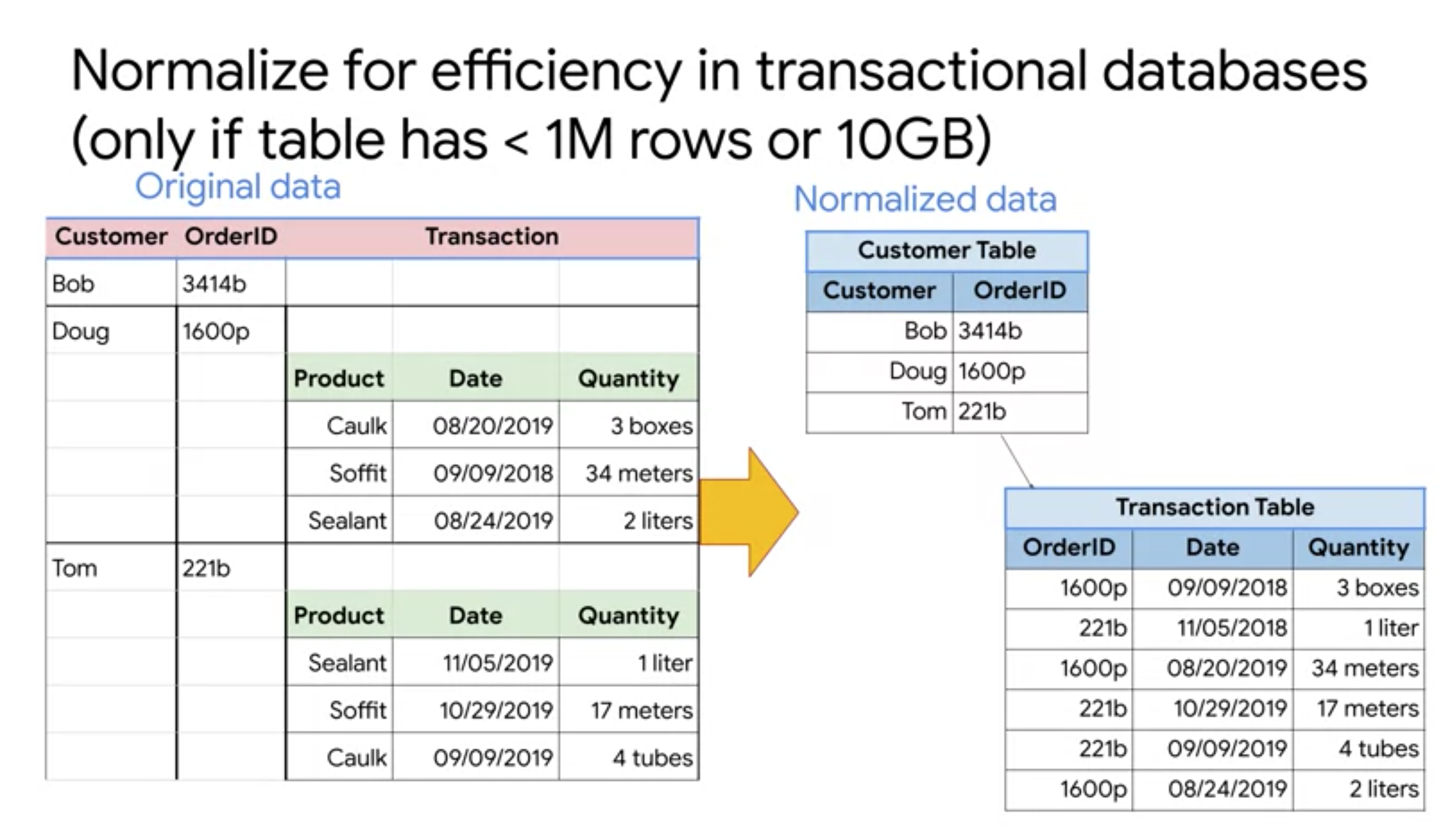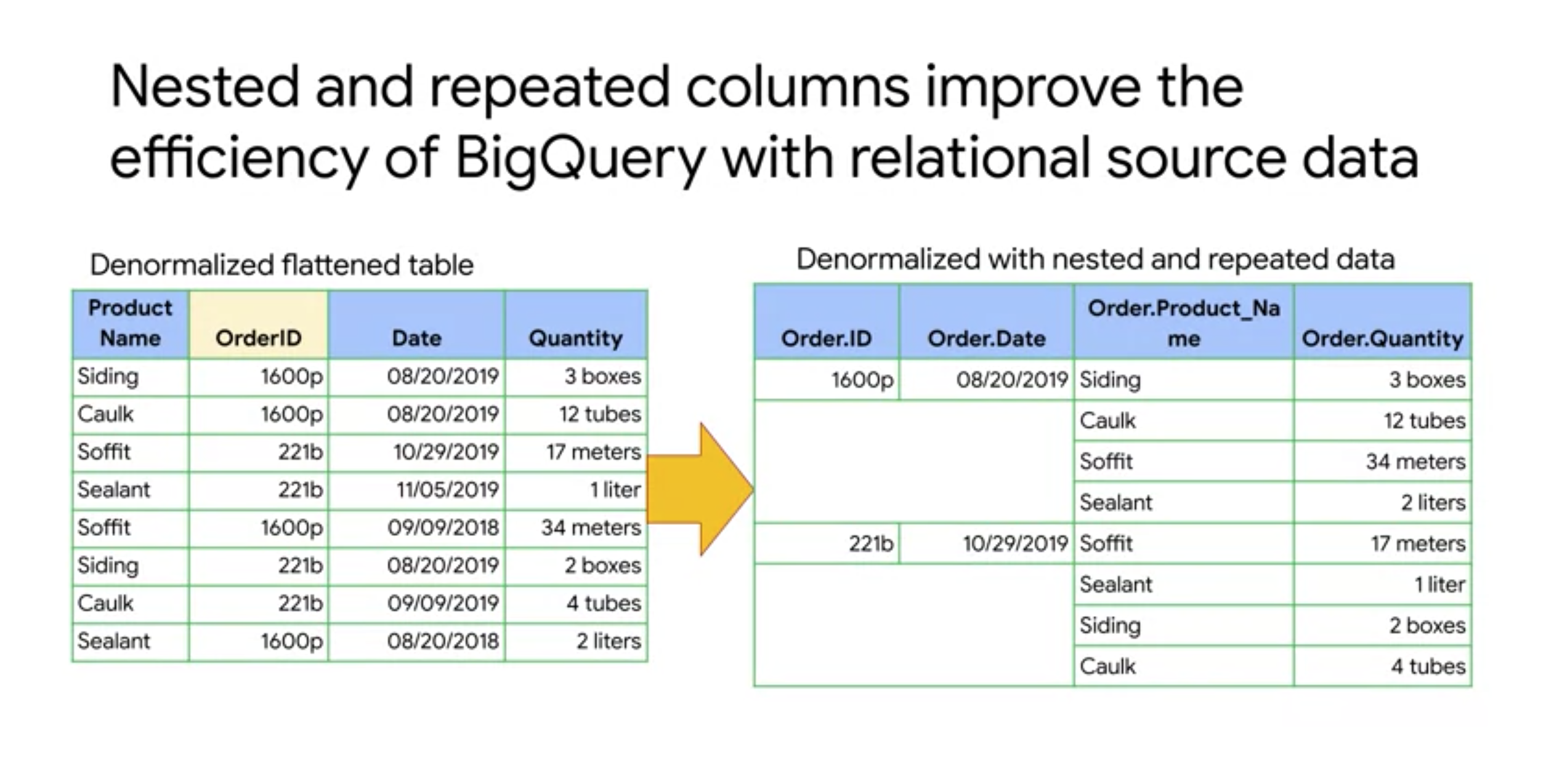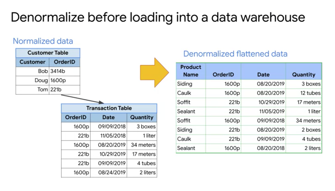 먼저 왼쪽 표 처럼 원본 데이터가 있는 상황을 가정해보겠습니다.[1] 이를 전통적인 RDBMS에서는 테이블에 중복된 정보가 저장되지 않도록 정규화를 적용하여 테이블을 쪼개어 데이터를 저장합니다. 그리고 특정 거래의 상세 정보를 확인하고 싶을 때에는 조인 연산을 통해서 원하는 정보를 가져오도록 합니다. 이 경우 데이터의 중복은 줄어들지만 조인 연산에 많은 비용이 발생하는 단점이 있습니다. 특히 빅 쿼리의 분석 대상인 페타 바이트 단위의 데이터를 테이블 간 조인하는 것은 비효율 적입니다. 그렇기 때문에 빅 쿼리에 적재하기 이전에 쪼개어 놓은 테이블을 다시 합쳐주는 denormalization 과정을 거칩니다.