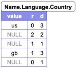 repetition level을 통해서 우리는 변수들이 등장하는 위치에 대해서 알 수 있게 되었지만, 아직 컬럼 기반 저장 데이터만 보고 json을 복구해 내기에는 부족합니다. 바로 NULL 값의 문제입니다. 이번에는 Name.Language.Country의 예시를 통해서 알아보겠습니다. Name.Language.Country의 컬럼 기반 저장 값은 아래와 같습니다.