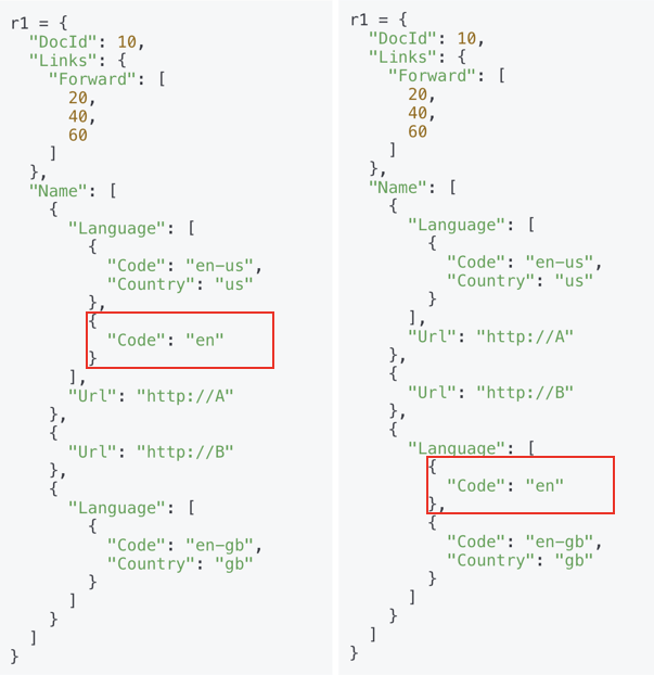 r과 d가 없다고 가정하고 Name.Language.Code를 보겠습니다.(이를 앞으로 value의 path라고 부르겠습니다.) en-us, en, NULL, en-gb, NULL 데이터가 있습니다만 우리는 이들이 어느 위치에서 등장하는지 알 수 없습니다. 가령 아래 그림 처럼 분명 en이라는 값이 저장되는 위치는 다르지만 컬럼별로 떼어내어 저장할 경우 결과가 동일해집니다.