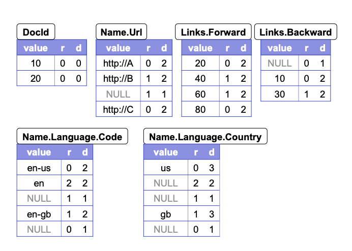 value가 있는 값들은 그냥 해당 변수의 path의 level이 d가 되며, Name.Language.Country의 경우에는 3이 됩니다. 문제는 NULL 값입니다. r1을 살펴보면 Name 아래의 첫 번째 원소의 Language의 두 번째 원소의 경우 Country 값이 없습니다. 이 경우 Name.Language 까지는 정의되어 있으니, definition level은 2가 됩니다. 반면에 r1의 Name의 두 번째 원소의 경우 아예 Language가 없어서 자연스럽게 Country가 NULL 값을 가집니다. 이 경우 definition level이 1이 됩니다.