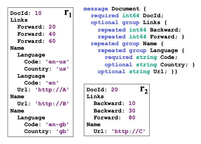 빅 쿼리의 전신인 Dremel 논문에 Nested and Repeated 스키마를 Columnar Storage에 저장하기 위한 데이터 모델이 자세히 소개되어 있습니다.[2]. (다소 난이도가 있어서 이해하는데 꽤나 고생했습니다.) 그럼 논문에 제시되어 있는 예시를 차례로 따라가면서 개념을 익혀보도록 하겠습니다.