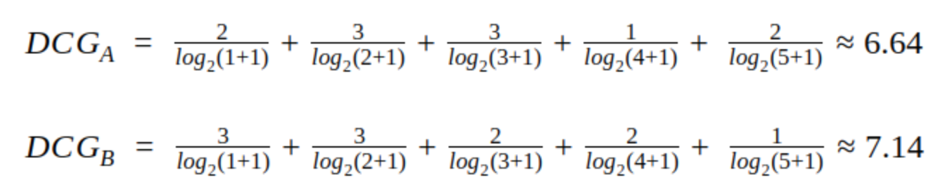 model A와 model B의 DCG를 구해보면 다음과 같습니다.