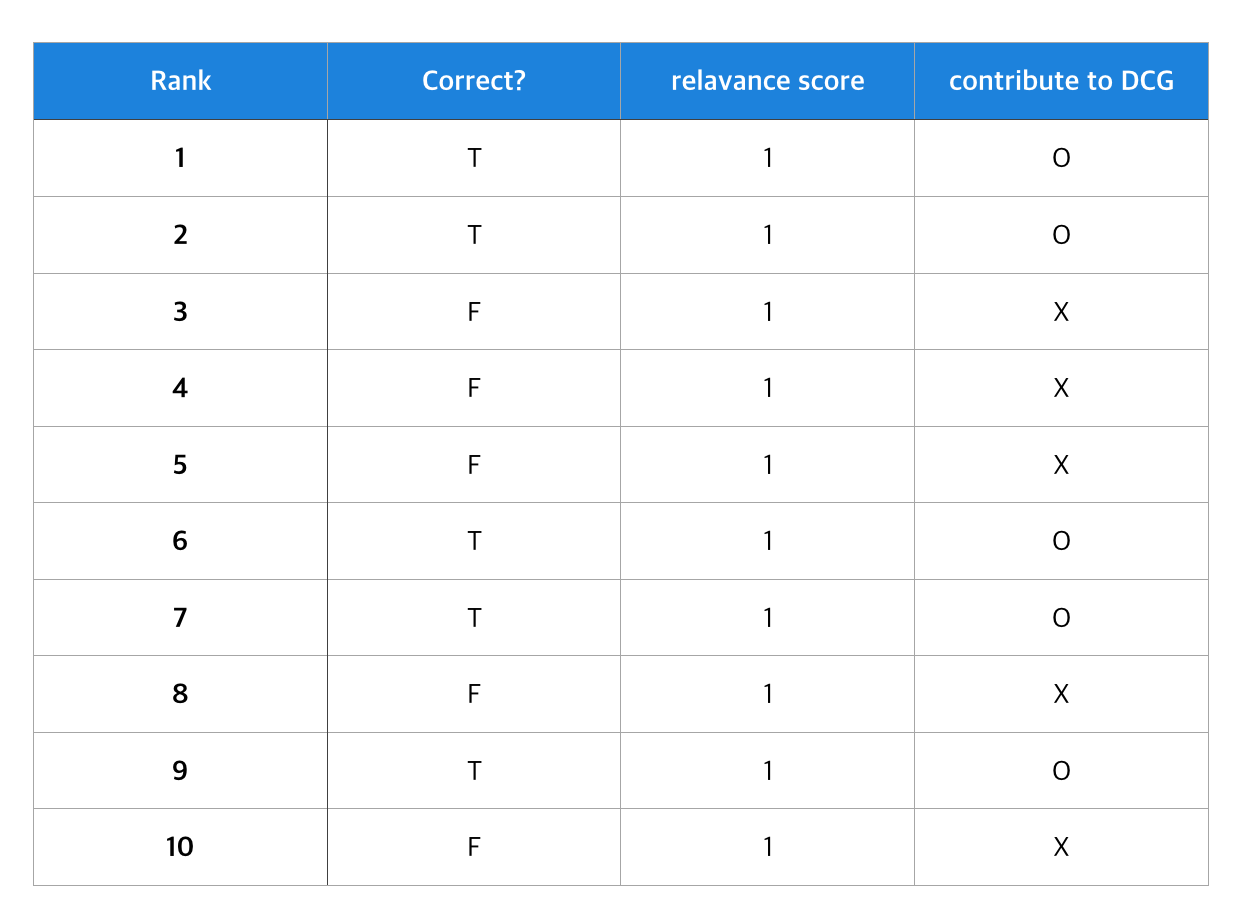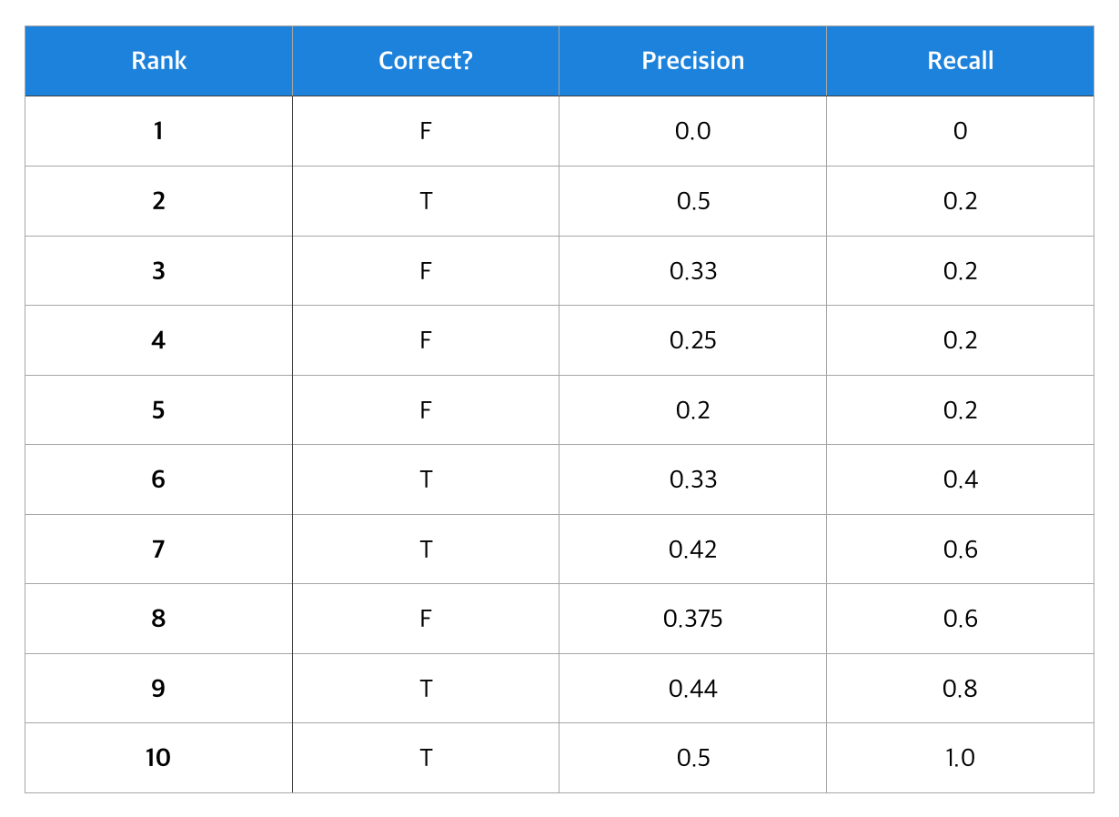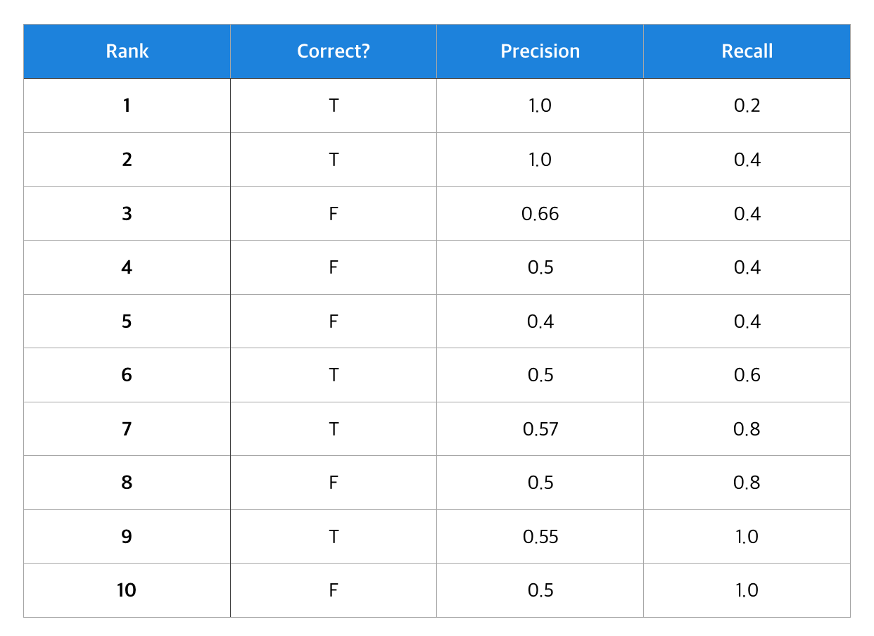 10개의 아이템을 추천하였고(RANK 1~10) 사용자가 실제로 소비하였는 지 여부를 Correct로 표시하였습니다. Rank가 낮을 수록 유저에게 우선적으로 추천되는 아이템입니다. 그리고 사용자가 실제로 소비한 전체 아이템은 5개라고 가정하겠습니다.