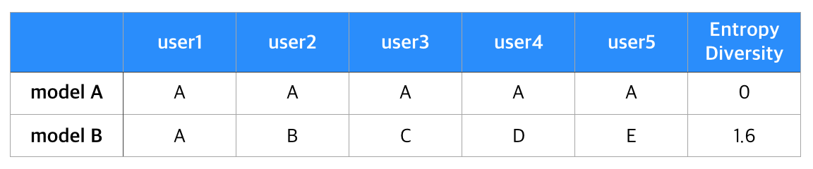 5명의 유저에게 A부터 다섯개의 아이템 가운데 한개를 추천해주는 model A와 model B가 있다고 가정하겠습니다. model A는 모든 유저에게 상품 A를 추천하였습니다. 이 경우 A가 추천될 확률은 1, 정보량은 0이 됩니다. 모든 유저대한 추천의 정보량이 0이므로 Entropy Diversity 역시 0이 됩니다. 반면 model B의 경우 모든 유저에게 각기 다른 상품을 추천합니다. 이 때 각각의 상품이 추천되는 확률은 0.2, 정보량은 0.32, 엔트로피는 1.6이 됩니다.