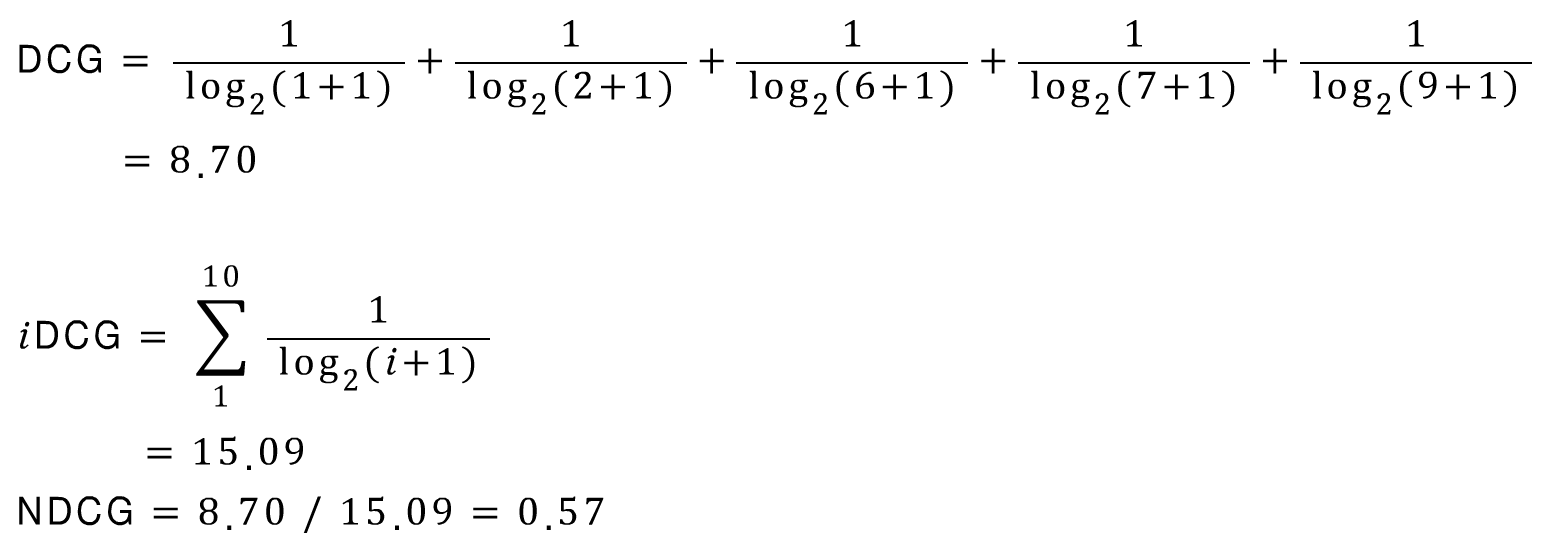 NDCG를 구하기 위해서는 먼저 DCG와 함께 추가적으로 iDCG를 구해주어야 합니다. iDCG의 i는 ideal을 의미하며 가장 이상적으로 relavace score를 구한 것을 말합니다. NDCG는 DCG를 iDCG로 나누어 준 값으로 0에서 1 사이의 값을 가지게 됩니다.