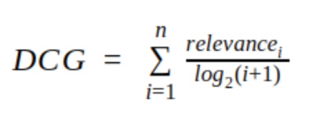 먼저 위치한 아이템일 수록 중요도가 높으니 model B가 model A보다 성능이 뛰어납니다. 하지만 이 둘의 CG는 동일하므로 CG로는 성능 평가를 할 수 없습니다. 그래서 먼저 위치한 relavance score가 CG에 더 많은 영향을 줄 수 있도록 할인의 개념을 도입한 것이 Discounted Cumulative Gain(DCG)입니다.