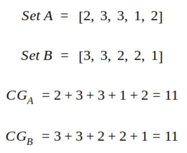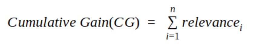 추천 엔진은 기본적으로 각 아이템에 대해서 사용자가 얼마나 선호할 지를 평가하며, 이 스코어 값을 relevance score라고 부릅니다. 그리고 이 relevance score 값들의 총 합을 Cumulative Gain(CG)라고 부릅니다.
