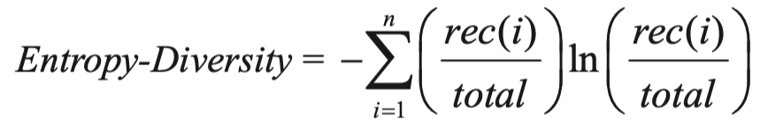 Entropy Diversity란 이러한 엔트로피의 개념을 추천 결과에 적용한 것입니다. 모든 사용자들에게 비슷한 종류의 상품을 추천할 경우 해당 상품 추천은 자주 발생하므로 정보량이 낮습니다. 반면 개인에게 맞춤화 된 추천은 발생 횟수가 적으므로 정보량이 높아집니다. 이들의 기대값을 구한 것이 바로 Entropy Diversity입니다.