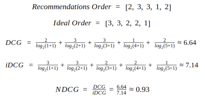 nDCG는 추천의 순서에 더 가중치를 두어서 성능을 평가하는 지표이며, 1에 가까울 수록 좋습니다. nDCG를 이해하기 위해서 자주 사용되는 예시를 먼저 살펴보겠습니다.[3] 그리고 앞서 살펴본 예시에서는 NDCG를 어떻게 구할 수 있는지 적용해보겠습니다.