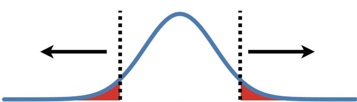 위의 예시는 단측 검정이었기 때문에 정규 분포의 왼쪽 꼬리 부분만 고려하였습니다. 만일 양측 검정이라면 양쪽 양향으로 극단적인 값이 등장할 확률을 계산해야하며, 아래 그래프 상에서 빨간색 면적에 해당합니다.