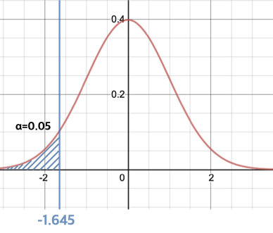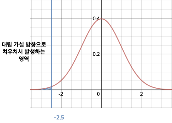 위 그래프에서 파란색 면적에 해당하는 부분이 귀무 가설이 틀릴 확률 α에 해당합니다. 만일 검정 통계량이 저 파란색 영역에 속하게 된다면 p-value가 α값보다 작아지므로 귀무가설이 기각되게 됩니다. 즉, 파란색 영역은 귀무 가설이 기각되는 기각역(rejection region)에 해당합니다. 예제에서 검정 통계량의 z-score는 -2.5로 기각 역에 속하게 되므로 귀무 가설을 기각할 수 있습니다.