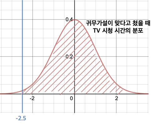 먼저 p-value를 사용하여 귀무 가설을 기각해보도록 하겠습니다. p-value란 귀무 가설이 맞다고 가정할 때 얻은 결과보다 극단적인 결과가 관측될 확률입니다. 귀무 가설이 맞다고 치면 평균 TV 시청 시간은 3시간입니다. 이를 정규화하여 표준 정규 분포 상으로 그려보면 아래와 같습니다.