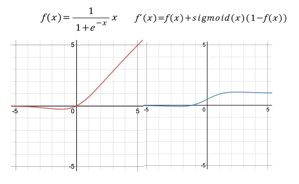 특징: ReLU를 대체하기 위해 구글이 고안한 함수입니다. 시그모이드 함수에 x를 곱한 아주 간단한 형태를 보입니다. 깊은 레이어를 학습시킬 때 ReLU보다 더 뛰어난 성능을 보여준다고 합니다.