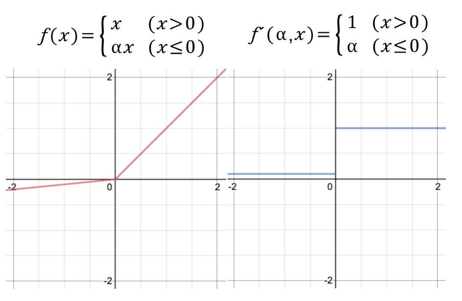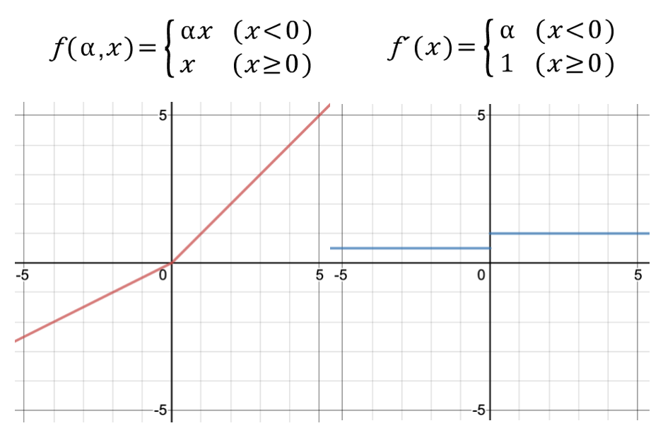 특징: ReLU와 거의 비슷한 형태를 갖습니다. 입력 값이 음수일 때 완만한 선형 함수를 그려줍니다. 일반적으로 알파를 0.01로 설정합니다. (위 그래프에서는 시각화 편의상 알파를 0.1로 설정하였습니다.)