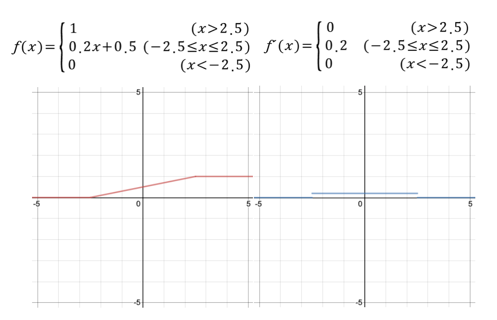 특징: 시그모이드 함수를 직선 형태로 핀 형태를 갖습니다. 미분 함수가 단순하기 때문에 그라디언트 계산 속도가 빠른 장점이 있습니다.