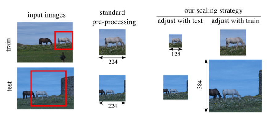 FixRes 기법의 핵심은 신경망이 Train 기간에 학습하는 물체의 크기와 Test 기간에 바라보는 물체의 크기가 다르다는 것입니다. 흔히 Image Classification을 학습시킬 때 Train 기간에는 이미지에서 랜덤하게 사각형 박스를 선택하고, 이를 crop하여 224x224 크기로 키워준 뒤 학습을 시킵니다. 이는 위 도표에서 input images - train 에서 흰색 말에 작은 박스를 치고 이를 224x224 크기로 키운 것에 잘 표현되어 있습니다.
